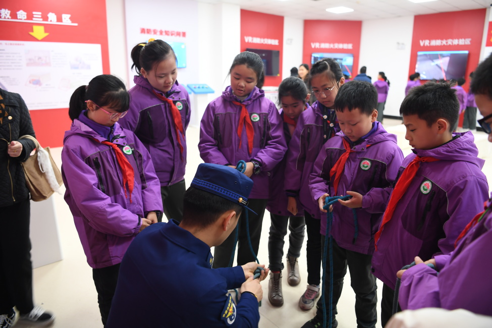 在校園“消”課堂中,消防宣傳員和同學(xué)們一起觀看了消防安全知識短片,帶領(lǐng)大家參觀了消防知識家庭防火、安全逃生、消防器材標(biāo)識等展板區(qū)域?!靶∨笥褌?nèi)绻诩依镉龅搅嘶馂?zāi)無法逃生,我們就需要用到繩結(jié)。在這里我將為大家展示下繩結(jié)的使用方法,大家可以拿著繩結(jié)跟著我做?!睘樨S富活動內(nèi)容,現(xiàn)場還設(shè)置消防VR火災(zāi)體驗、結(jié)繩訓(xùn)練、消防知識搶答、模擬滅火體驗等多項功能性項目,引發(fā)學(xué)生積極參與。